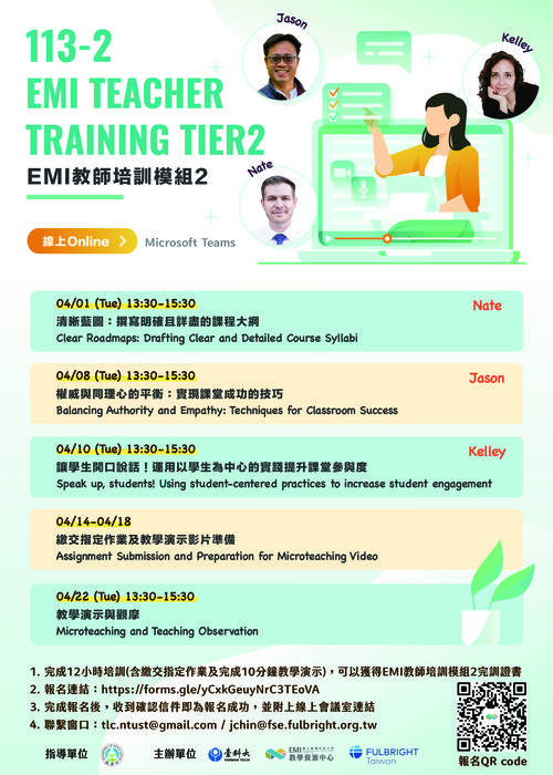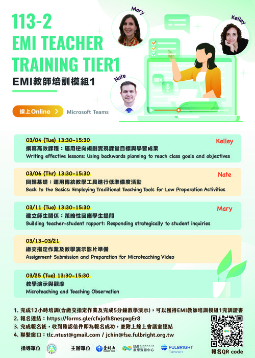 每個模組包含課程設計、教學互動及溝通技巧三大主題,搭配指定作業及教學演示環節,增加你的EMI實戰技巧~~